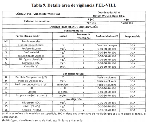 . Artículo duodécimo. Área de Vigilancia Estación pelagial Sector Villarrica (PEL-VILL), correspondiente a la red de observación de la norma. El área de vigilancia denominada "estación pelagial sector Villarrica" que, al igual que PEL-CE, corresponde a todo el cuerpo de agua pelágico cuyo límite horizontal está definido por la línea del veril 25 metros y cuyo límite vertical comprende desde la superficie hasta la profundidad máxima del lago. Las campañas de monitoreo tendrán las características y objetivos que se indican en la tabla 9.