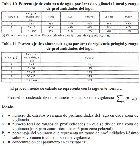 Artículo decimoctavo. Metodología de cálculo de la concentración media por área de vigilancia. La concentración media de un parámetro en un área de vigilancia, para cada campaña de monitoreo, corresponde a la integración de los resultados obtenidos en las diferentes profundidades del Lago Villarrica, según el porcentaje del volumen de agua del punto donde se obtiene la muestra, de acuerdo a lo indicado en las tablas 10 y 11.