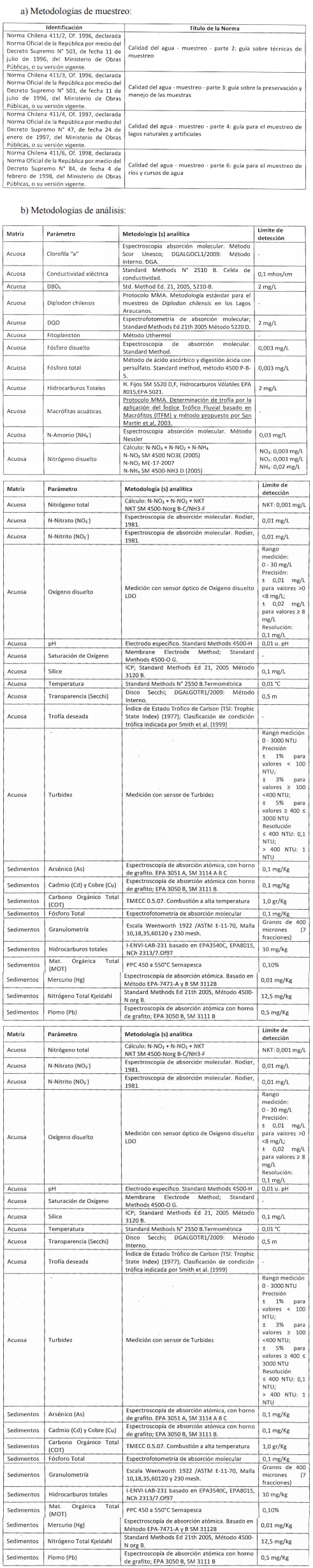 Artículo único transitorio. Durante el período que no se encuentren disponibles en el Compendio de Métodos de Medición, Muestreo y Análisis de la Superintendencia del Medio Ambiente, los parámetros considerados en el programa de medición y control de la calidad ambiental de las aguas continentales superficiales del Lago Villarrica, se utilizarán los siguientes métodos: