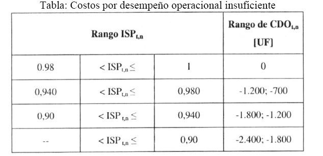 xix) De acuerdo a lo establecido en los artículos 2.4.2 y 2.4.6.5 de las Bases de Licitación, se considera que el Nivel de Servicio de la Concesión es suficiente en todos aquellos casos en que el Índice de Servicio Prestado (ISP) de cada trimestre es superior al valor de 0,980 (98,0%) e insuficiente en todos aquellos casos en que el 1SP de cada trimestre es inferior o igual al valor de 0,980 (98,0%). En estos casos el costo por desempeño operacional (CDO t,n ) se determinará de acuerdo a los rangos que se establecen en la Tabla siguiente: