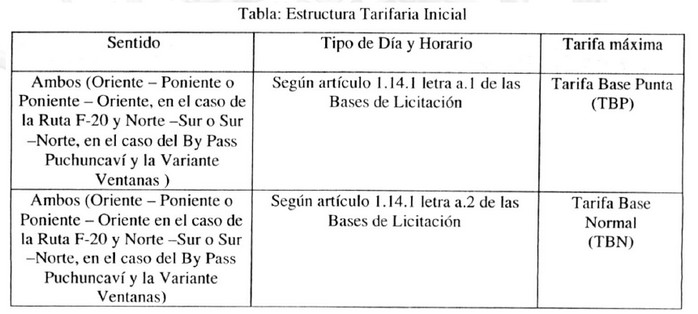 . De conformidad con lo establecido en el artículo 1.14.3.1, el Adjudicatario o Concesionario, según corresponda, estará facultado para aplicar la siguiente Estructura Tarifaria Inicial que regirá desde la autorización de la Puesta en Servicio Provisoria de la Fase 1 señalada en el artículo 1.10.1 letra A, ambos de las Bases de Licitación, de acuerdo a lo indicado en la siguiente Tabla: