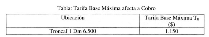 El valor de la Tarifa Base Máxima (T0), que corresponde al cobro de peaje a ser aplicada en un Sistema de Cobro por Derecho a Paso en un sentido, expresado en pesos chilenos de 31 de diciembre del 2013, que regirá a partir de la Puesta en Servicio Provisoria de la Fase 1, se indica en la Tabla siguiente: