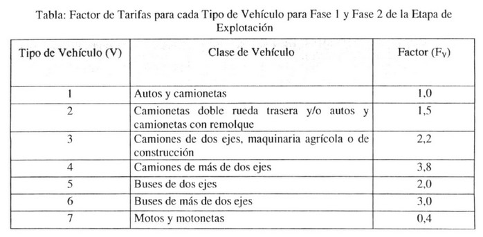 De conformidad con lo establecido en el artículo 1.14.6 de las Bases de Licitación, para efectos del cobro de Tarifas, se deberá considerar el Factor de Tarifas para cada Tipo de Vehículos que se indican en la Tabla siguiente: