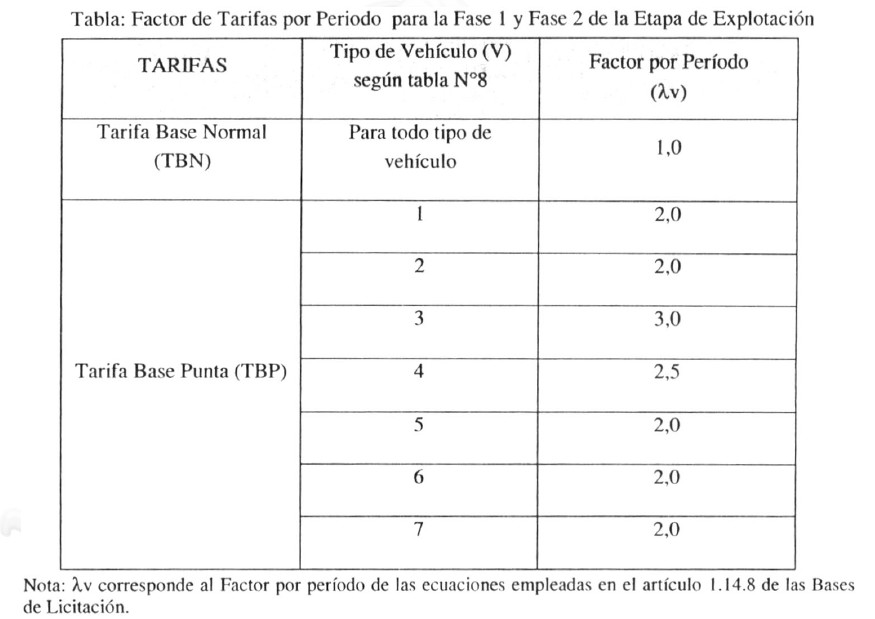 . De conformidad con lo establecido en el artículo 1.14.7 de las Bases de Licitación, la Sociedad Concesionaria podrá cobrar tarifas diferenciadas en los períodos definidos como Tarifa Base Normal y Tarifa Base Punta. En la Tabla siguiente se indican los factores por período.