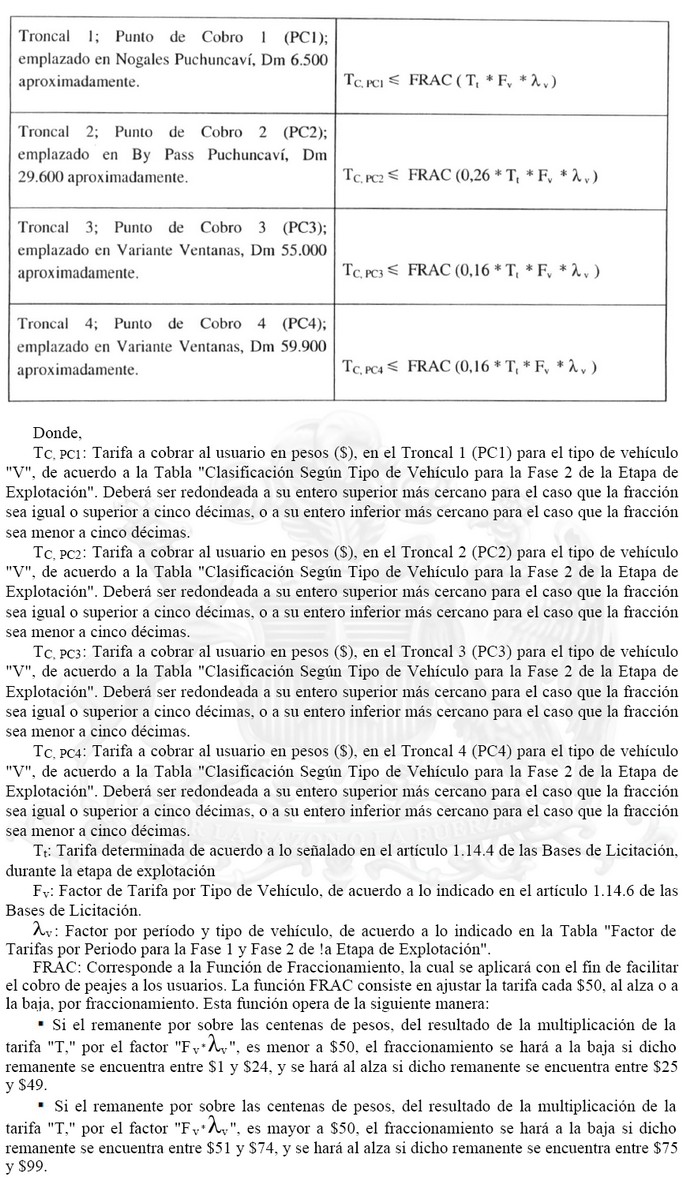 La Contraloría General ha dado curso al instrumento del rubro, que adjudica el contrato de concesión para la ejecución, reparación, conservación y explotación de la obra pública fiscal denominada "Relicitación Concesión Camino Nogales-Puchuncaví", pero cumple con manifestar, respecto de la "Tabla: Estructura Tarifaria Inicial", contenida en el numeral 18, acápite "Derechos", literal ii), que la tarifa máxima que corresponde según el artículo 1.14.1 letra a.1, de las bases de licitación, es la Tarifa Base Normal (TBN), en tanto que la tarifa máxima conforme a la letra a.2 del mismo artículo es la Tarifa Base Punta (TBP), y no como allí se indica.