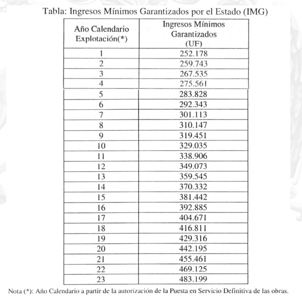 iii) Según lo dispuesto en los artículos 1.12.7 y 1.12.7.1, se establece un mecanismo de Ingresos Mínimos Garantizados (IMG) por el Estado, siempre y cuando la Sociedad Concesionaria no solicite renunciar a éste conforme al artículo 1.12.2.1.2, todos de las Bases de Licitación, el cual permite distribuir los riesgos derivados de la incertidumbre respecto del número de vehículos que circularán por los Puntos de Cobro y que pagará su tarifa durante la Etapa de Explotación de la concesión.
