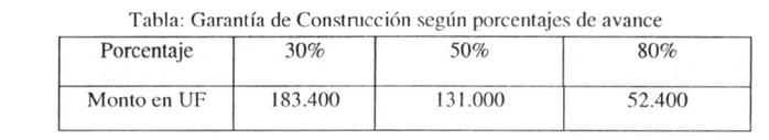 Una vez que haya sido acreditada la ejecución del 30%, 50% u 80% de la obra mediante la correspondiente Declaración de Avance prevista en el artículo 1.9.2.6 de las Bases de Licitación, la Garantía de Construcción podrá ser reemplazada por diez boletas de garantía bancaria, de igual monto, o bien, por una póliza de seguro de garantía para concesiones de obras públicas según lo dispuesto en el artículo 1.8.1.3 de las Bases de Licitación, debiéndose cumplir con las demás condiciones de acuerdo a lo exigido en el primer párrafo del artículo 1.8.1.1 de las Bases de Licitación. El plazo de vigencia de la Garantía de Construcción será la diferencia entre el plazo máximo de construcción y el tiempo transcurrido hasta la correspondiente declaración de avance, más 6 (seis) meses. En este caso el valor total de la Garantía de Construcción a entregar por el Concesionario, en reemplazo de la garantía vigente, será el que se indica en la Tabla siguiente: