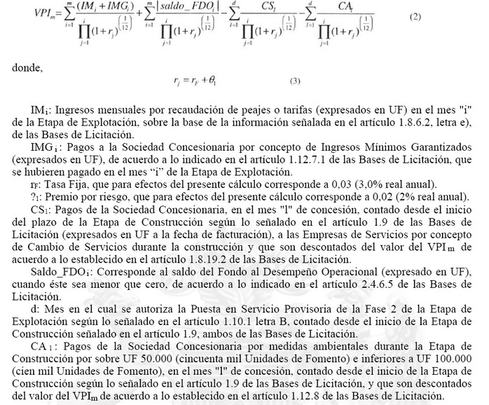 . Donde el término VPI m corresponde al Valor Presente de los Ingresos de la Sociedad Concesionaria (expresados en UF), calculado en el mes "m" de concesión, contado desde la fecha de autorización de la Puesta en Servicio Provisoria de la Fase 1, señalada en la letra A del artículo 1.10.1 de las Bases de Licitación (el mes en que se autoriza la Puesta en Servicio Provisoria de la Fase 1 es m=1), y actualizado al mes anterior al de dicha autorización de la Puesta en Servicio Provisoria de la Fase 1, e ITC se refiere al valor de los Ingresos Totales de la Concesión ofertados por el Licitante Adjudicatario en su Oferta Económica, por un valor de UF 6.923.256 (seis millones novecientos veintitrés mil doscientos cincuenta y seis Unidades de Fomento), según se señala en el artículo 3.2 de las Bases de Licitación.