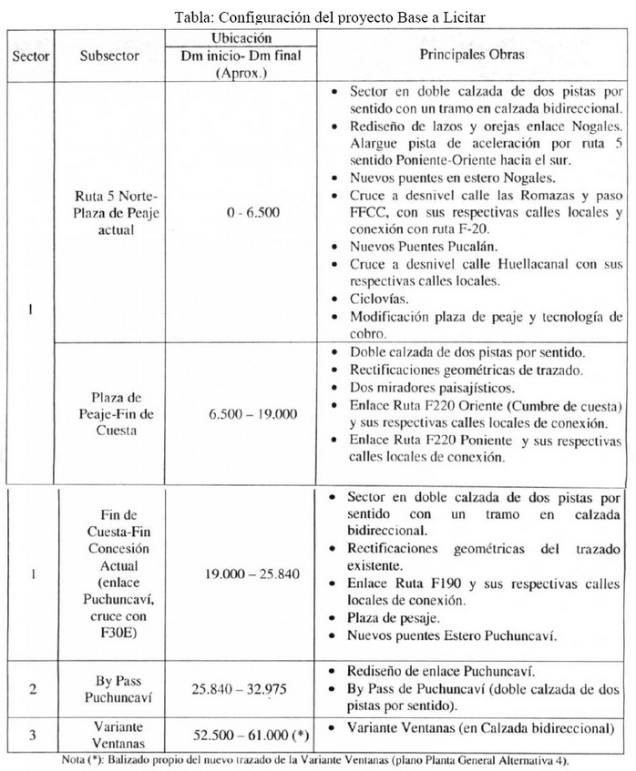 Dicho proyecto de concesión se emplaza en las comunas de Nogales en la Provincia de Quillota, y de Puchuncaví y Quintero, en la Provincia de Valparaíso, ambas de la Región de Valparaíso, y consiste en la construcción, mantención y explotación de las obras de la actual concesión con el objetivo de mejorar el estándar técnico y los niveles de servicio, además, considera el aumento de su capacidad vial, respondiendo a los mayores requerimientos de tránsito previstas en los próximos años para el Área de Influencia del Proyecto, y por consiguiente, mejorar las condiciones de seguridad y confort de los usuarios. El proyecto de Relicitación, adiciona 16 kilómetros en total de nueva vialidad, correspondientes al By Pass de Puchuncaví (7 kilómetros) y la Variante Ventanas (9 kilómetros), lo que representa un 60% de nueva vialidad que se incorpora a la actual Concesión.