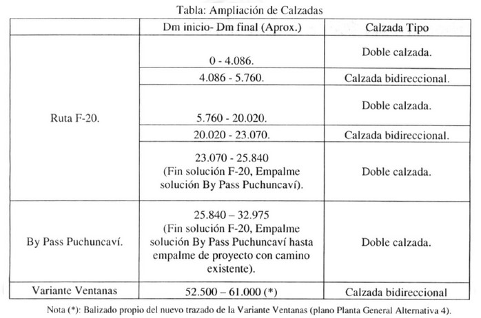 . Ampliación de calzadas. De acuerdo a lo establecido en el artículo 2.3.1.1 de las Bases de Licitación, la Sociedad Concesionaria deberá ampliar a doble calzada y adaptar la calzada existente en todos los sectores y/o tramos, según el detalle de la Tabla siguiente: