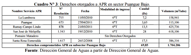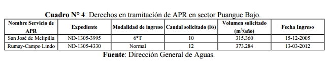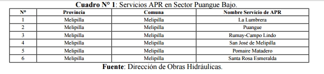4.- Que, por otra parte, respecto del análisis de requerimiento de agua para el abastecimiento de la población rural, el referido informe consigna que según datos de la Dirección de Obras Hidráulicas, en la Región Metropolitana actualmente existen 136 Comités de Agua Potable Rural (A.P.R.), y 6 de éstos operan con cargo a la disponibilidad susceptible de extraer del sector hidrogeológico de aprovechamiento común denominado Puangue Bajo, y que se proyecta que sufrirán déficit futuros en cuanto a sus fuentes de abastecimiento de agua. Dichos comités son los indicados en el cuadro siguiente: