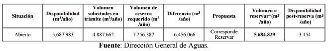 15.- Que la figura de la reserva contenida en el artículo 147 bis inciso 3° del Código de Aguas, se materializa mediante la denegación parcial de una solicitud de derecho de aprovechamiento de aguas, lo que implica constituir sólo una pequeña parte y denegar el resto de la misma, es por ello que procede descontar de la disponibilidad existente en el sector, el volumen y el caudal que se le constituirá a la solicitud de aprovechamiento de aguas que motivó la declaración de la reserva.