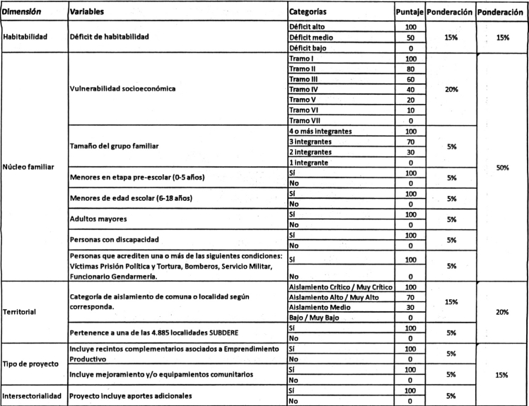 11. En virtud de la facultad señalada en el artículo 38 del DS N°10 (V. y U.) de 2015, establécense los siguientes factores de puntaje y sus ponderaciones, para ser aplicados en el presente llamado:
