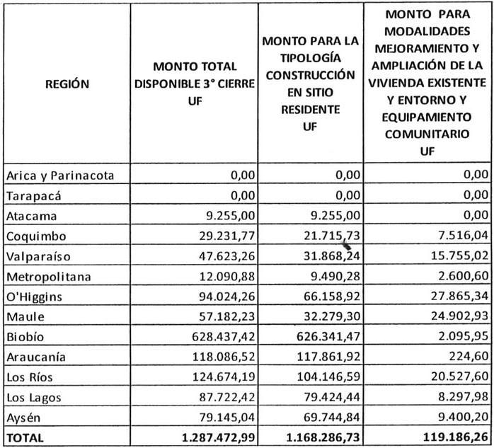 . (*) Monto asignado a la Región del Biobío incluye 202.242 UF que se destinarán específicamente a la atención de familias de la Provincia de Arauco.