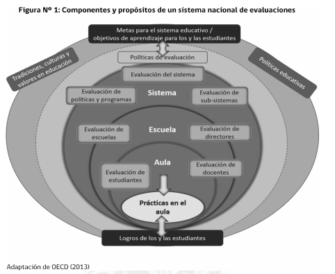 La meta fundamental de la evaluación en un sistema educativo es proveer información para tomar decisiones que permitan mejorar. Tal como muestra el siguiente diagrama, un sistema nacional de evaluación comprende diferentes componentes que cumplen distintos propósitos específicos o funciones dentro de éste, incluyendo evaluación a nivel de sistema, evaluación de políticas o programas, evaluación del desempeño de docentes, evaluación de directivos, evaluación de establecimientos educacionales y evaluación de aprendizajes de los y las estudiantes (a nivel individual, realizada al interior de los establecimientos). El Plan de Evaluaciones Nacionales, e Internacionales se centra en el diseño de la evaluación externa de aprendizajes(3) como un componente central de la evaluación de establecimientos educacionales y del sistema educativo.