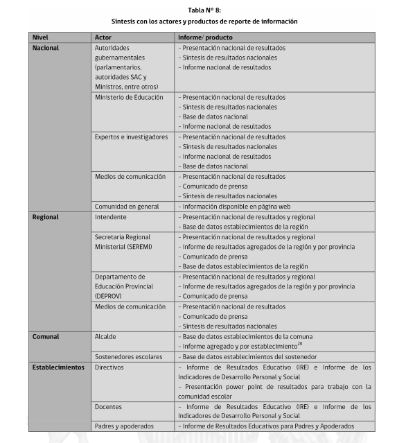 (2) El Equipo de tarea fue presidido por Lorena Meckes (investigadora del Centro de Estudios de Políticas y Prácticas en Educación, CEPPE) y conformado además por Paulina Bustos (Jefa del Departamento de Educación de Curicó), Alejandro Carrasco (Subdirector de CEPPE), Rafael Carrasco (Fundación Chile), Bárbara Eyzaguirre (Fundación Astoreca), Juan Eduardo García-Huidobro (Universidad Alberto Hurtado), Jorge Manzi (director de Mide UC), Mariano Rosenzvaig (Director de Educación de la Municipalidad de Providencia), Guillermo Scherping (asesor del Colegio de Profesores), Ernesto Treviño (Director Ejecutivo del CPCE, Universidad Diego Portales), Xavier Vanni (investigador del CIAE, Universidad de Chile) y María José Zañartu (Belén Educa). En representación de la Subsecretaria de Educación participó Jaime Portales, y en representación de la Agencia de la Calidad participaron Carlos Henríquez (Secretario Ejecutivo) y Juan Bravo (Jefe de la División de Logros de Aprendizaje).