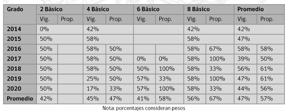 No obstante, la disminución de pruebas que contempla el nuevo plan de evaluación implica una disminución de la cantidad de información respecto a lo que habría sido incorporado en caso que el plan vigente se mantenga. Esta disminución de información se genera porque el plan propuesto implica que las pruebas aplicadas a 6° y 8º Básico pasarían a ser bi-anuales (en comparación con la anualidad actual de dichas pruebas) y no con la eliminación de grados. La bi-anualidad de un mayor número de pruebas implica que, cada dos años, la información se repetiría respecto a la del año anterior para un número relativo mayor de pruebas. En efecto (y considerando las ponderaciones a cada prueba/año), a partir de la tabla 2-4, que muestra que la información referente a pruebas que se repite entre uno y otro, es posible observar que la información repetida llega a ser de un 100% en 6º básico (años par) y en 8º básico (años impar).