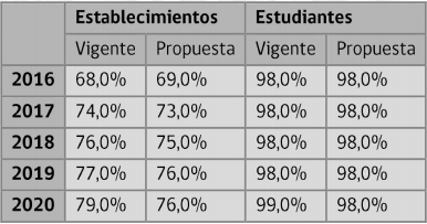 Quizás más relevante es el caso de los establecimientos que vería limitada su transición desde la categoría de desempeño insuficiente. Las simulaciones realizadas y descritas en el Anexo 3, indican que para 2019, un 69% de los establecimientos insuficientes se mantendría en la misma categoría en el escenario del plan vigente. Este porcentaje aumenta a 72% en el escenario del plan propuesto, lo que implica que alrededor de 17 establecimientos más en el plan propuesto que en el vigente (considerando un universo de 580 establecimientos en categoría insuficiente) se mantendrían en la misma categoría de desempeño.