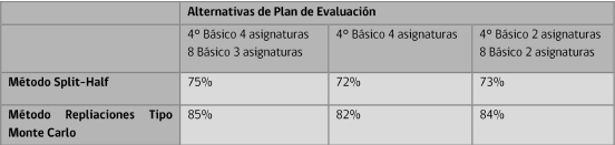 Los análisis de confiabilidad realizados en base a la información y metodología disponible, indican que la disminución de la consistencia dada la disminución de pruebas asociada al nuevo plan de evaluación, no sería de alta magnitud. En efecto, nuestros datos tienden a corroborar lo planteado por los expertos en medición educacional respecto a que lo más importante para mantener la confiabilidad de la ordenación es aumentar la cantidad de observaciones independientes de un establecimiento (o grados), y no necesariamente aumentar las observaciones dentro de cada grado (Hill y DePascale, op cit). La tabla 2-6 muestra un ejercicio preliminar donde se calcula el indicador según los métodos de Split Half y simulaciones de Montecarlo en tres escenarios: uno donde se incorporan 4 asignaturas en 4º básico y 3 asignaturas en 8º básico (similar al plan actual), uno donde se elimina completamente 8º básico y un tercero donde se mantienen ambos grados pero se eliminan asignaturas (similar al plan propuesto). El ejercicio realizado, muestra que, en comparación con el escenario inicial y para ambos indicadores, la consistencia de la clasificación disminuye en 3 puntos al eliminar un grado. Sin embargo, al eliminar asignaturas la consistencia disminuye menos: 2 puntos en el caso del método Split-Half y 1 punto en el caso del método de Montecarlo.