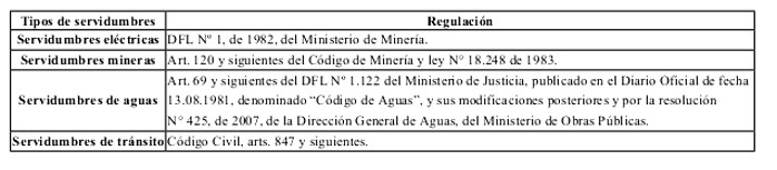 1. En esta materia se debe considerar el artículo 880 del Código Civil ya citado, en virtud del cual el Ministerio de Bienes Nacionales se encuentra facultado en su calidad de propietario, para constituir las servidumbres que estime necesario. Estas servidumbres se rigen por los artículos 820 y siguientes del Código Civil y por normas especiales de acuerdo al tipo de servidumbre de que se trate, según da cuenta, a modo de ejemplo, la siguiente tabla: