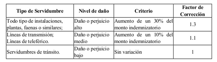 Así, al monto mínimo de indemnización equivalente al 50% de la tasación comercial de la superficie solicitada para la constitución de la servidumbre, se le deberá aplicar el factor de corrección según el tipo de servidumbre de que se trate.