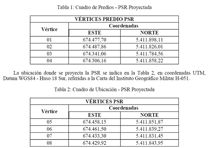Segundo. El proyecto contempla la distribución de gas natural gasificado proveniente de una Planta Satélite de Regasificación (en adelante PSR) de Gas Natural Licuado (en adelante GNL), la cual estará ubicada en dos predios pertenecientes al Loteo La Vara, ubicados en la Ruta V - 505, La Vara Sitio 53, Rol 2869-53 y Sitio 52, Rol 2869-52 de la comuna de Puerto Montt, la cual se muestra en los planos LP_PM/PV_003, Rev. C, Lámina 05 de 07, y LP_PM/PV_005, Rev. C. Los vértices de los predios donde se proyecta la PSR se indican en la Tabla 1, en coordenadas UTM, Datum WGS84 - Huso 18 Sur, referidas a la carta del Instituto Geográfico Militar H-051.