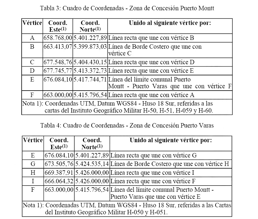 La zona de concesión definitiva solicitada para la distribución de gas natural, en las comunas de Puerto Montt y Puerto Varas, corresponde al área interior del perímetro formado por los límites que se detallan en tabla 3 y tabla 4 respectivamente.