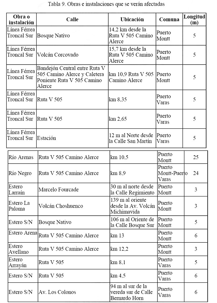 Décimo. La materialización de proyecto en la zona de servicio solicitada, en las comunas de Puerto Montt y Puerto Varas, comprometerá durante la construcción las siguientes obras e instalaciones existentes, que se detallan en la Tabla 9: