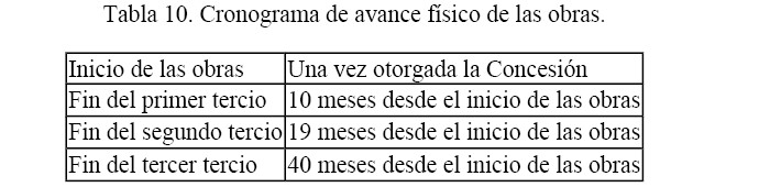 Décimo tercero. El cronograma de avance físico de la construcción de las obras se indica en la Tabla 10.