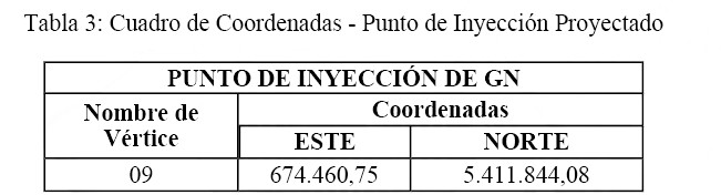 . Tercero. El punto de inyección de suministro a la red de distribución se proyecta ejecutar en la comuna de Puerto Montt, de acuerdo con lo indicado en los Planos LP_PM/PV_003, Rev. C, Lámina 05 de 07, y LP_PM/PV_005, Rev. C. El lugar donde se proyecta el punto de inyección se indica en la Tabla 3, en coordenadas UTM, Datum WGS84-Huso 18 Sur, referidas a la Carta del Instituto Geográfico Militar H-051.