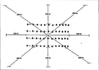 "En el caso de las actividades experimentales en áreas de manejo y explotación de recursos bentónicos, se realizará una prospección con grabación subacuática de 8 transectas radiales equidistantes. Para el establecimiento de las transectas se considerará como punto inicial, el punto medio de los módulos de cultivo de especies bentónicas exóticas. No obstante lo anterior, la extensión de 100 m sobre la que se realizará la grabación subacuática será a partir de los módulos de cultivo. Las transectas deberán ser grabadas mediante buceo o sistema remoto y tener un ancho aproximado de un metro (figura Nº 1).