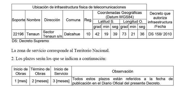 1. Autorízase a la concesionaria para instalar, operar y explotar un Servicio Intermedio de Telecomunicaciones, que únicamente provea infraestructura física para telecomunicaciones, por medio de instalaciones y redes destinadas al efecto, tal como sigue: