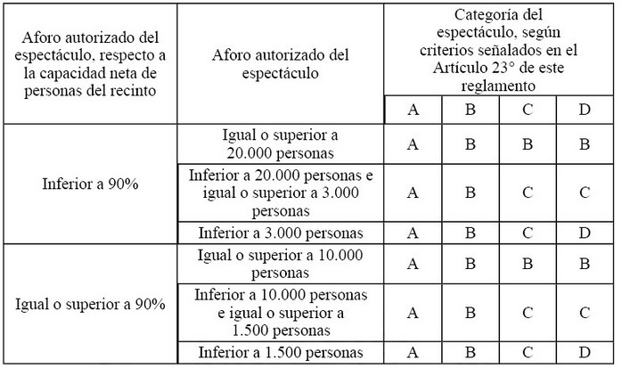 |Asimismo, para estos casos, la respectiva resolución de autorización para la realización de espectáculos de fútbol profesional indicará, en relación al respectivo espectáculo, a lo menos, el aforo autorizado, desglosado por cada sector habilitado para el público que se utilizará; la cantidad de guardias de seguridad que deberá utilizar el organizador; y lo señalado en el artículo 35° de este reglamento, con excepción de las letras k), n), ñ), o) y s).