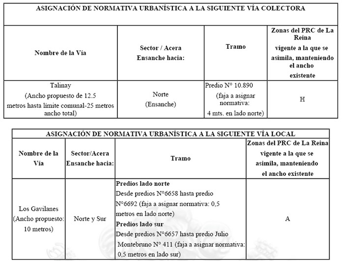 1.- Que a las vías comunales Los Gavilanes y Talinay, que están desafectadas de declaratoria de utilidad pública por decreto alcaldicio N° 802, de La Reina del 28.04.2015, publicado en el D.O. N° 41.150, de fecha 06.05.2015, y que no tienen asignadas normativa urbana por el decreto alcaldicio N°1.402, de La Reina del 12.08.2010, publicado en D.O. de fecha 19.08.2010, es que se debe asignar normativa urbanística a ambas vías.