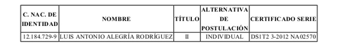 1º.- Exclúyase de las nóminas de postulantes seleccionados para el goce del Subsidio Habitacional correspondiente al Tercer Llamado Nacional 2012, a don Luis Antonio Alegría Rodríguez, Cédula de Identidad Nº 12.184.729-9, a favor de quien se extendió el respectivo Certificado de Subsidio Habitacional, que en dicho considerando se señala y déjase sin efecto su Certificado de Subsidio Habitacional.