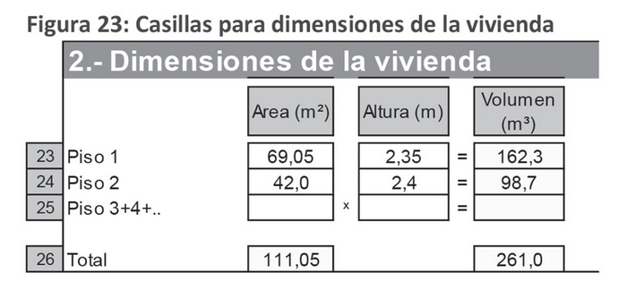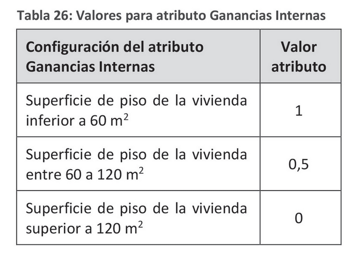 . El valor del atributo Ganancias Internas, se debe identificar en la Tabla 26 en función de la superficie de piso de la vivienda. Se debe entender como superficie del piso de la vivienda, la descrita en la sección 12.3.1 del presente manual.