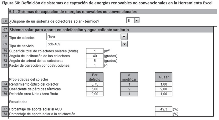 En las filas 77 y 78 de la Herramienta Excel o en la hoja "Consumo" de la herramienta web (ver 12.8), se muestran los resultados del aporte de energía solar para el sistema de agua caliente sanitaria y para el sistema de calefacción.