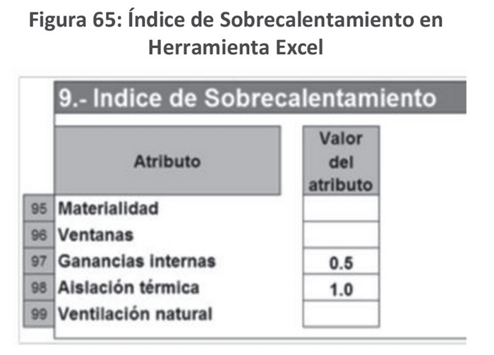 Este índice se calcula en base a la identificación de los atributos que podrían provocar sobrecalentamiento en una vivienda. Estos atributos fueron analizados previamente en un modelo de cálculo dinámico del edificio, en base a varias tipologías de viviendas típicas y en los distintos climas de Chile. Del resultado de este análisis se obtienen las ponderaciones consideradas y los coeficientes indicados en las tablas siguientes.