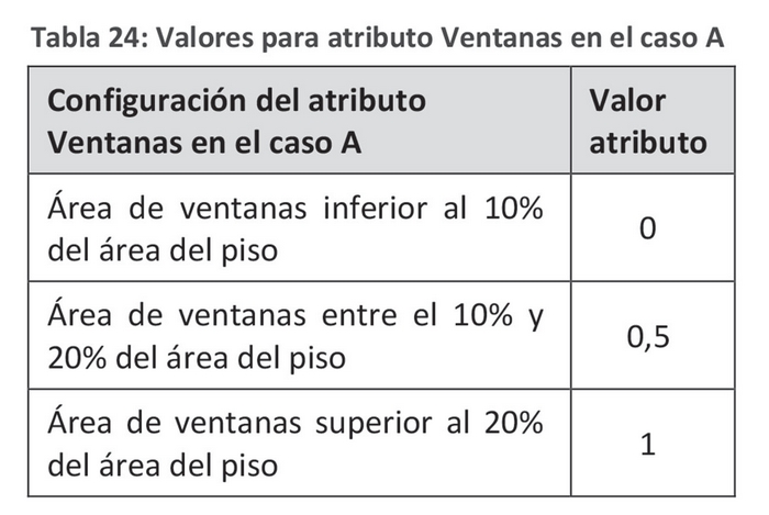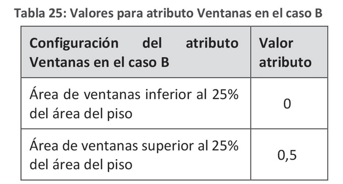 .Cuando ya se identificó si el atributo de Ventanas corresponde al caso A o B, se debe identificar el valor del atributo en función de la proporción porcentual (%) entre el área de piso y el área de ventanas (vano) desde la Tabla 24 o Tabla 25 según corresponda. La superficie construida de la vivienda corresponde a la descrita en la sección 12.3.1 del presente manual.