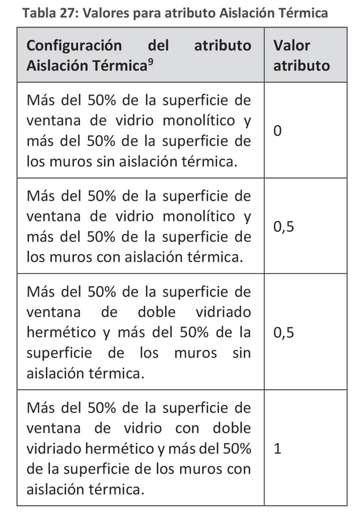 . El valor del atributo Aislación Térmica, se debe identificar en la Tabla 27 en función del tipo de vidrio de las ventanas y la aislación térmica de los muros.