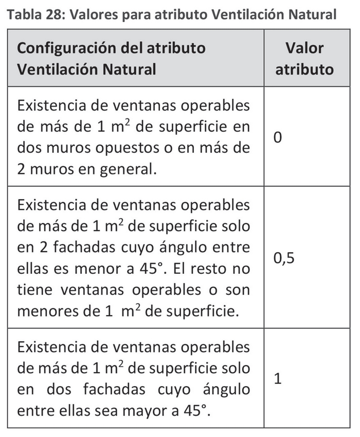 El valor del atributo Ventilación Natural, se debe identificar en la Tabla 28 en función de la cantidad, área y ubicación de las ventanas operables.
