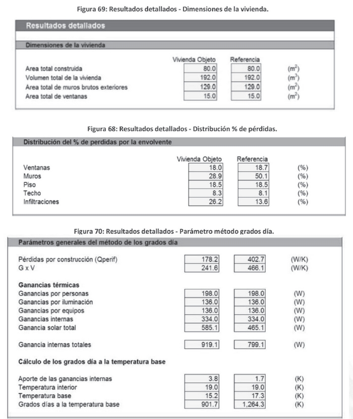 La Herramienta Excel incluye la hoja resultados detallados. Esta hoja no es parte integral de la calificación, por lo cual es posible realizar una calificación completa sin considerar esta página. Sin embargo, se ha incluido en la Herramienta de calificación como información útil para el análisis de los resultados. En efecto, esto permitirá, en base a un análisis de consistencia, ayudar a verificar que no se ha incurrido en ningún error en el ingreso de la información. Por otra parte, permitirá analizar con más detalle el comportamiento térmico de la vivienda y orientar eventuales mejoras para optimizar el comportamiento térmico de ésta.