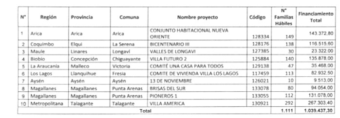 . 2. Apruébase la nómina de proyectos seleccionados con su respectivo financiamiento total, incluyendo los servicios de asistencia técnica y fiscalización técnica de obras, para el otorgamiento de subsidios del Programa Habitacional Fondo Solidario de Elección de Vivienda en la alternativa de postulación colectiva, para proyectos de Construcción en Nuevos Terrenos, en las Regiones de Arica, Coquimbo, Maule, Biobío, La Araucanía, Los Lagos, Aysén, Magallanes y Metropolitana de Santiago, correspondiente al proceso de selección cuyo cierre de postulación se efectuó el día 28 de octubre de 2016, del llamado efectuado por resolución exenta Nº 6.086 (V. y U.), de 2016: