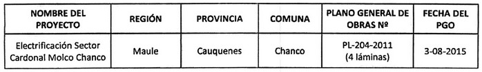 Artículo 1°.- Otórgase a la Empresa Eléctrica CGE Distribución S.A., concesión definitiva para establecer, operar y explotar en la Región del Maule, provincia de Cauquenes, comuna de Chanco, las instalaciones de servicio público de distribución de energía eléctrica constitutiva del proyecto que se denomina "Electrificación Sector Cardonal Molco Chanco", el cual se detalla a continuación:
