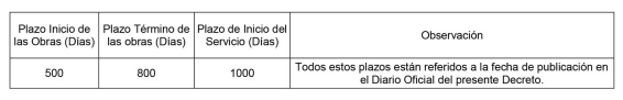 1. Autorízase a la concesionaria para modificar el plazo de inicio de obras, término de obras e inicio de servicio, de la concesión otorgada por decreto supremo N° 241, de 2011, y modificada por decreto exento N° 912, de 2014, según se indica a continuación: