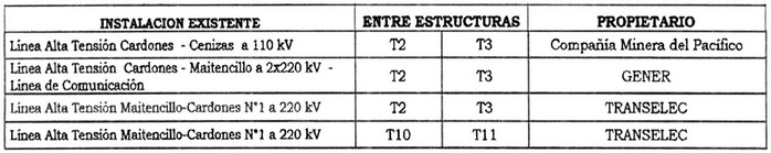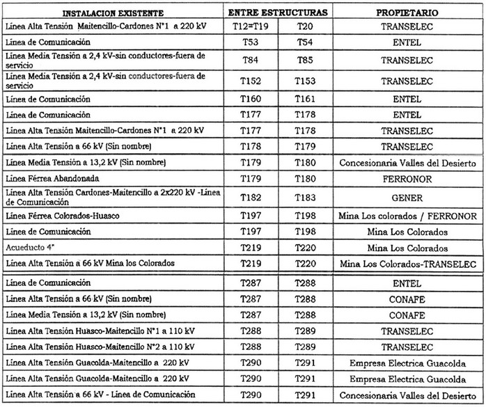 En su recorrido, el proyecto "Línea Cardones - Maitencillo 2x500 kV" afectará las líneas eléctricas, obras e instalaciones existentes que se indican a continuación: