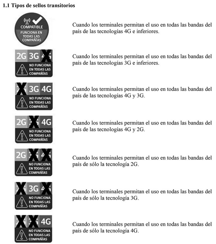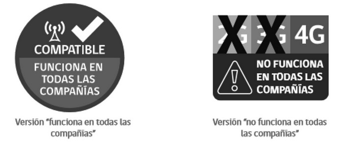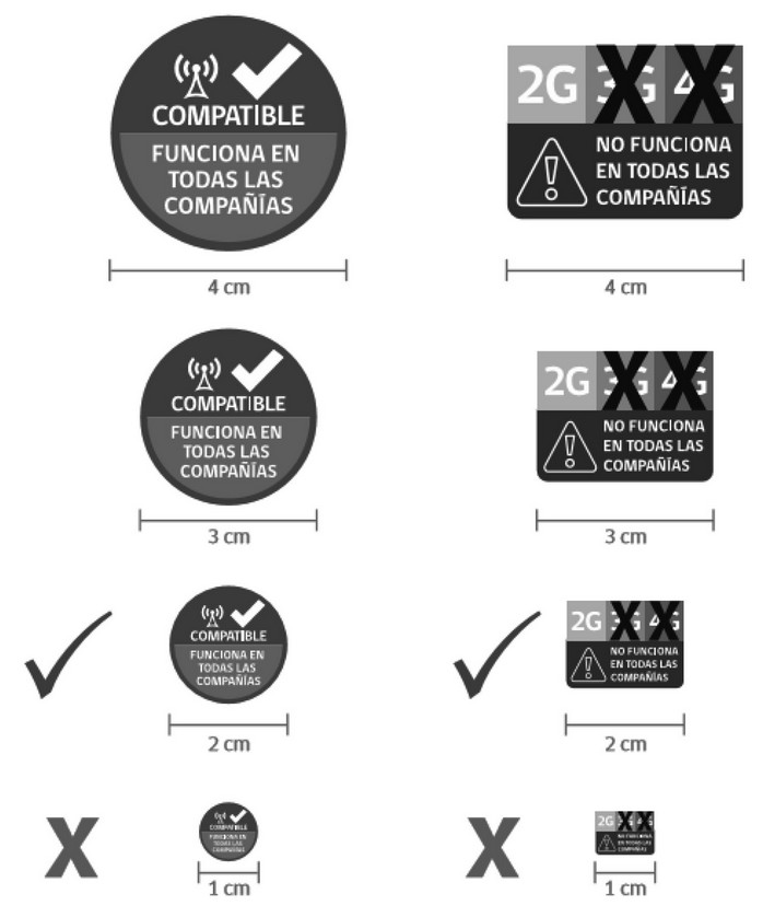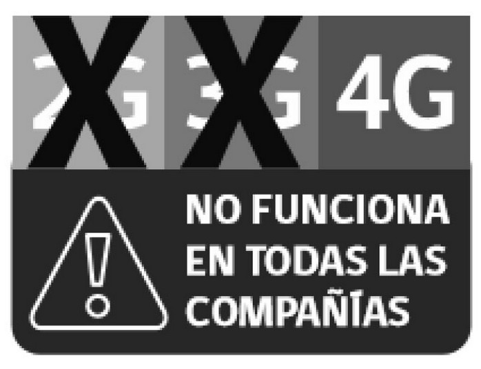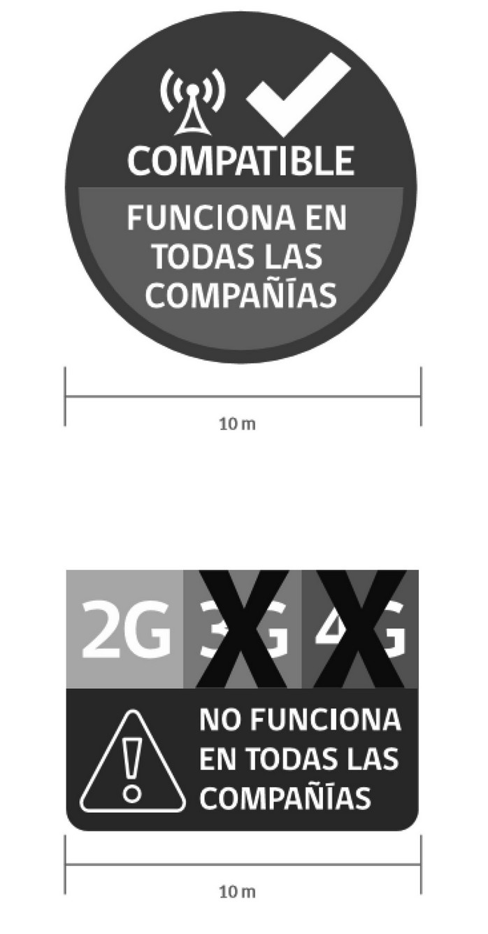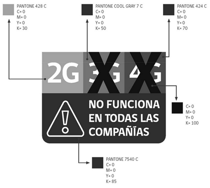 - El logotipo: textos que identifican -al interior de los cuadrados- los tipos de tecnología respecto de los cuales se advierte el soporte o no por el equipo de todas las bandas desplegadas en el país para cada una de dichas tecnologías (2G, 3G y 4G). Además, en el rectángulo inferior, se complementará con la frase "NO FUNCIONA EN TODAS LAS COMPAÑÍAS", reforzando la idea que el equipo móvil NO soporta alguna(s) banda(s) de alguna de las diferentes tecnologías.