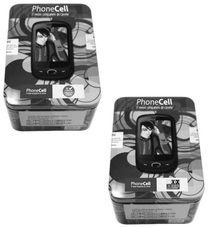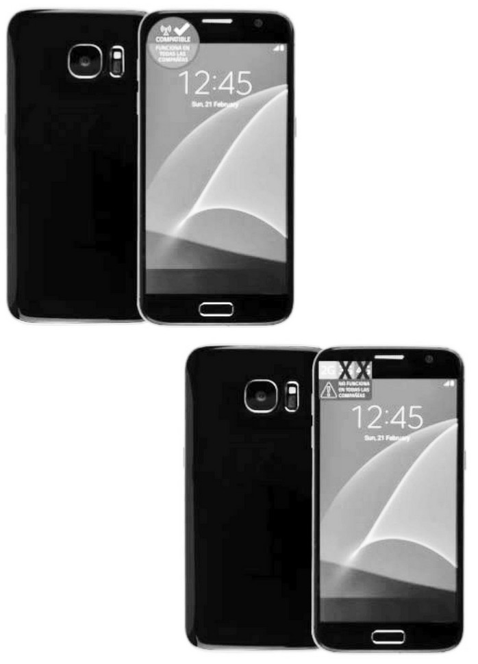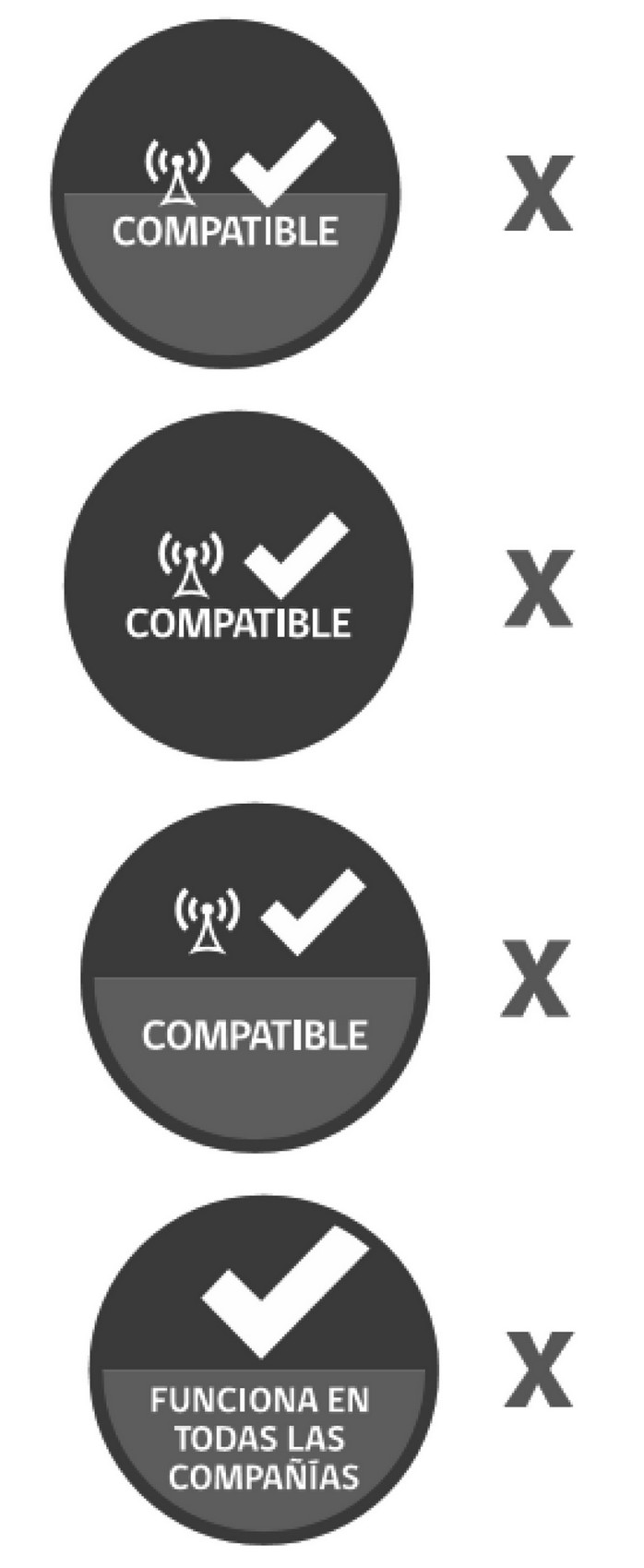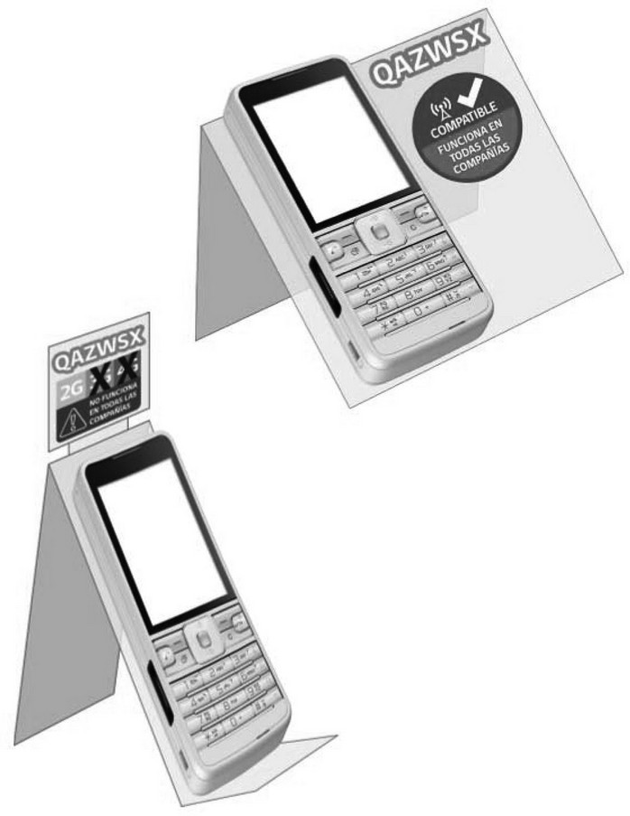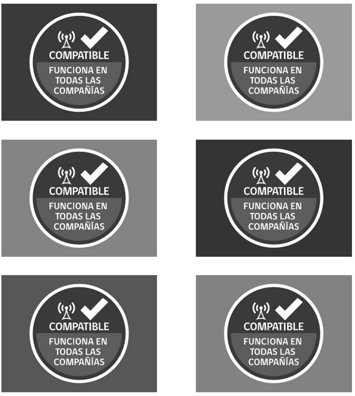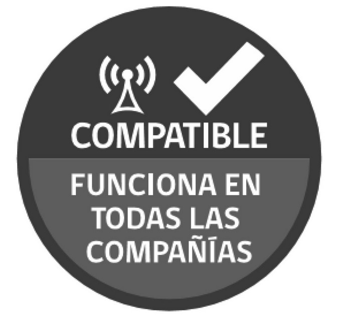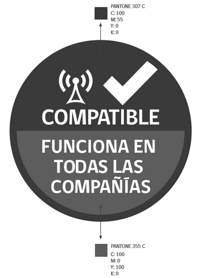 - El logotipo: textos insertos en el círculo antes indicado, tanto en la parte superior como inferior. En la parte superior corresponderá a la expresión "compatible", reforzando la idea que el equipo está certificado para su uso en todas las bandas de las diferentes tecnologías, y en la parte inferior corresponderá al texto "FUNCIONA EN TODAS LAS COMPAÑÍAS", que refuerza el concepto de que el equipo móvil es compatible en todas las compañías.