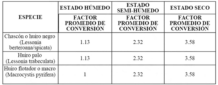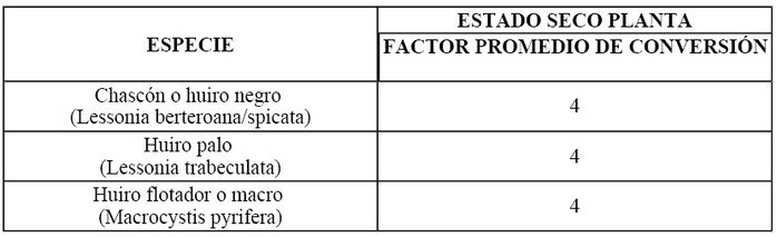 Artículo 3º: Para efectos de estandarizar la información proporcionada en las declaraciones de operación y permitir una adecuada fiscalización de las cuotas de captura, se establecen los siguientes factores promedio de conversión para los estados de humedad de los recursos huiro negro (Lessonia berteroana/spicata), huiro palo (Lessonia trabeculata) y huiro flotador (Macrocystis pyrifera), extraídos en la III y IV Región: