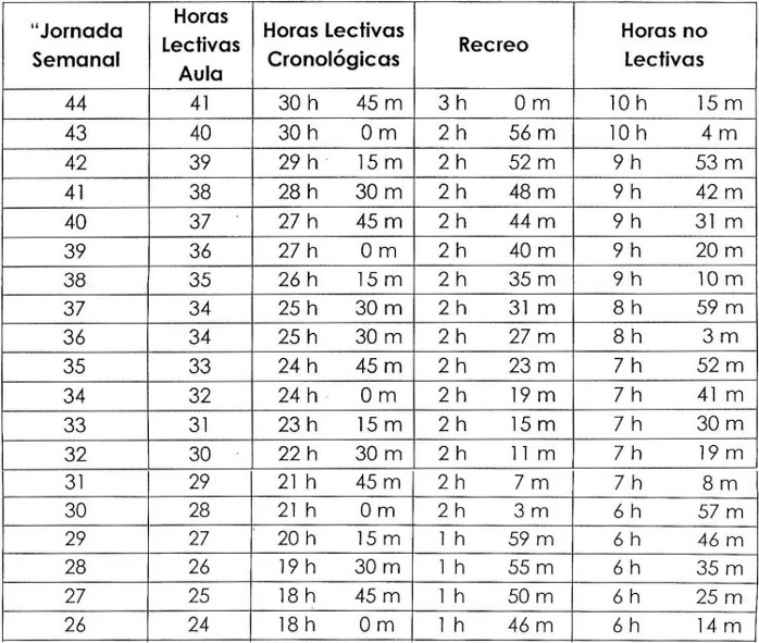 "Artículo 129: La jornada de trabajo semanal de los profesionales de la educación se conformará por horas docentes de aula, que tendrán una duración máxima de 45 minutos cada una; actividades curriculares no lectivas, y recreos.